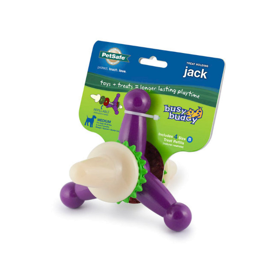 Give your dog a new twist on one of the most popular games in the world with the PetSafe® Busy Buddy® Jack. This fun toy has textured rubber sprockets and smooth nylon knobs that make it challenging for your dog to access the treat rings. It’s designed for tough chewers and includes 4 Busy Buddy® rawhide treat rings (additional treat ring refills available separately). It’s easy to clean and top-shelf dishwasher safe. Choose from small, medium and large sizes. For dogs over 6 months old.
